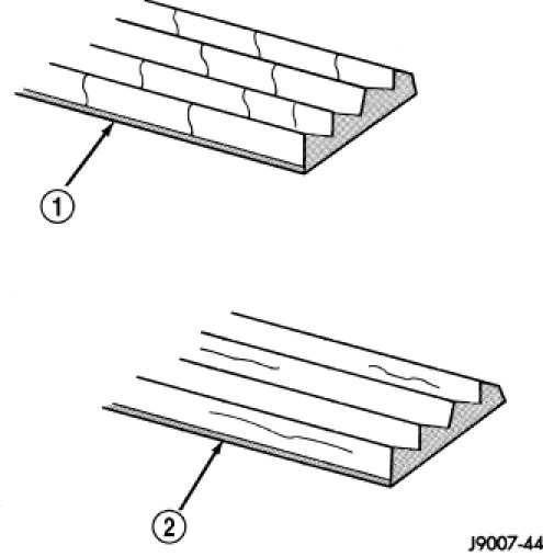 When diagnosing serpentine accessory drive belts, small cracks that run across the ribbed surface of the belt from rib to rib (1), are considered normal. These are not a reason to replace the belt. However, cracks running along a rib (not across) (2) are not normal. Any belt with cracks running along a rib must be replaced. Also replace the belt if it has excessive wear, frayed cords or severe glazing.