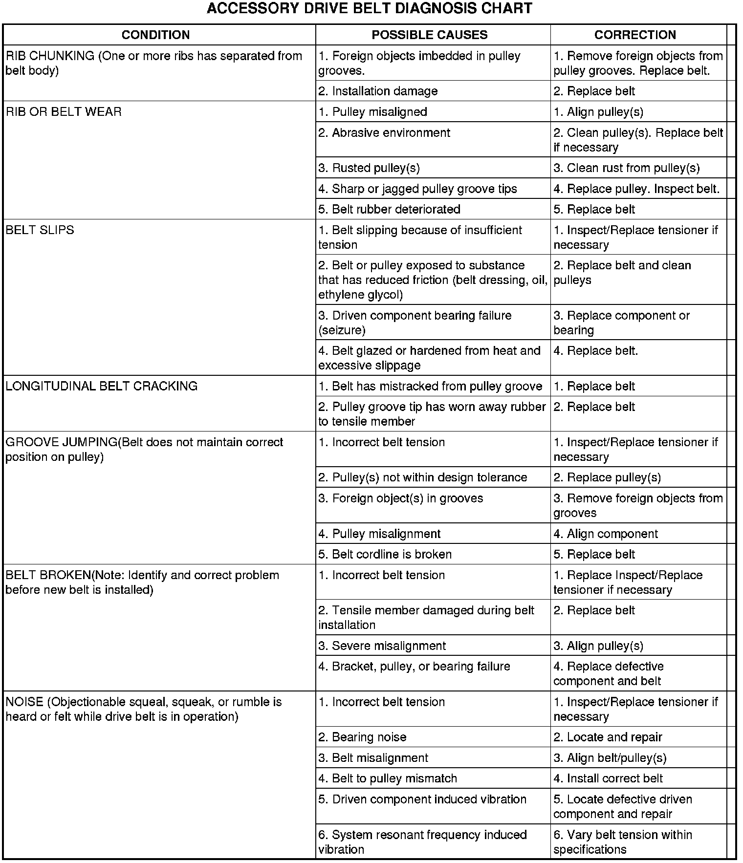 Noises generated by the accessory drive belt are most noticeable at idle. Before replacing a belt to resolve a noise condition, inspect all of the accessory drive pulleys for contamination, alignment, glazing, or excessive end play.