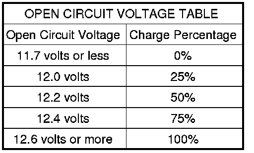 See the Open-Circuit Voltage Table. This voltage reading will indicate the battery state-of-charge, but will not reveal its cranking capacity. If a battery has an open-circuit voltage reading of 12.4 volts or greater, it may be load tested to reveal its cranking capacity.