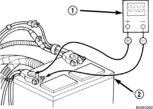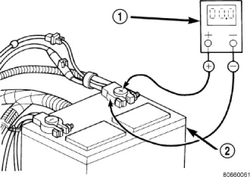 2. Connect the positive lead of the voltmeter (1) to the battery (2) positive terminal post. Connect the negative lead of the voltmeter (1) to the battery (2) positive cable terminal clamp. Rotate and hold the ignition switch in the Start position. Observe the voltmeter. If voltage is detected, correct the poor connection between the battery positive cable terminal clamp and the battery positive terminal post.