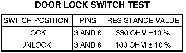 Using an ohmmeter, determine if switch resistance is correct in the Lock and Unlock switch positions. Refer to Wiring Diagrams for harness connector pin-outs.