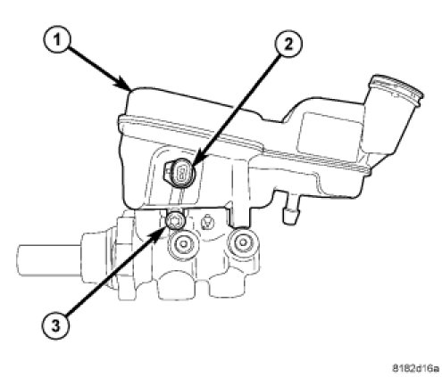 The brake fluid level switch (2) is mounted through the center of the fluid reservoir (1). The switch can be serviced separately from the master cylinder fluid reservoir.