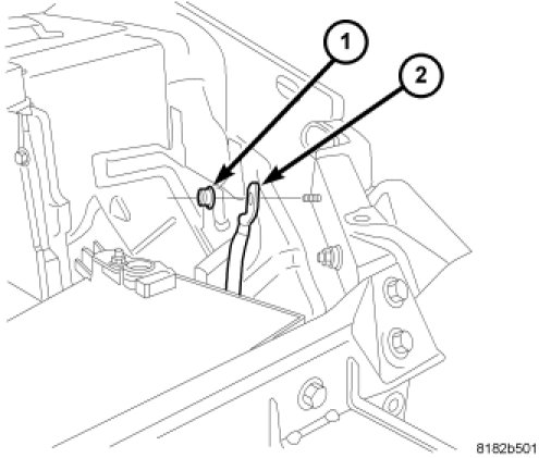 5. Install the nut (1) securing the negative cable (2) to the body ground stud. Tighten the cable nut to 12 Nm (9 ft. lbs.).