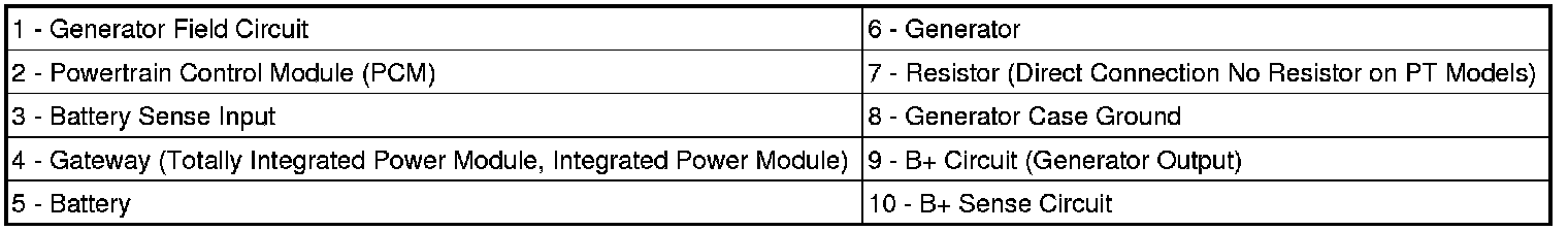 Voltage is monitored at B+ sense circuit (10) to insure the cable is connected. If the B+ circuit (generator output) (9) cable is loose anywhere in the circuit the B+ sense circuit (10) will show high voltage. This condition causes the PCM (2) to shut down the generator field circuit (1). Because of this new feature, pin 2 of the field connector is internally connected to the B+.