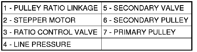 The pulley ratio linkage moves to the left direction of the stepper motor. The line pressure circuit opens due to the movement of the ratio control valve which links to the pulley linkage, and line pressure is applied to the primary pulley.