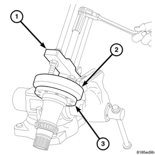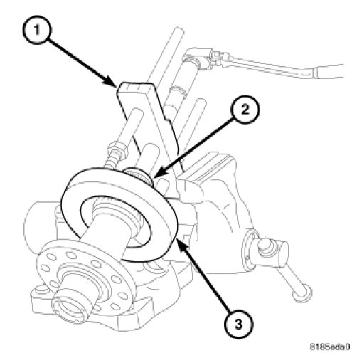 28. Remove the shim (3) under the bearing cup (1). Measure and record the size of the shim.