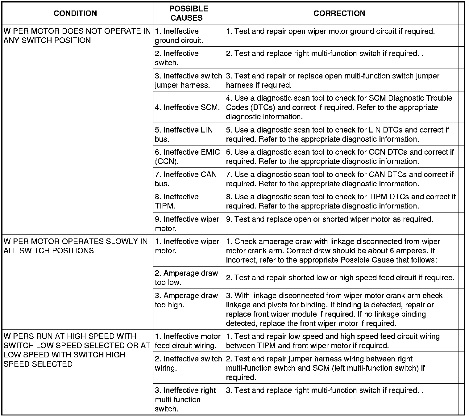 However, conventional diagnostic methods will not prove conclusive in the diagnosis of the front wiper and washer system or the electronic controls or communication between other modules and devices that provide some features of the front wiper and washer system. The most reliable, efficient, and accurate means to diagnose the front wiper and washer system or the electronic controls and communication related to front wiper and washer system operation requires the use of a diagnostic scan tool.