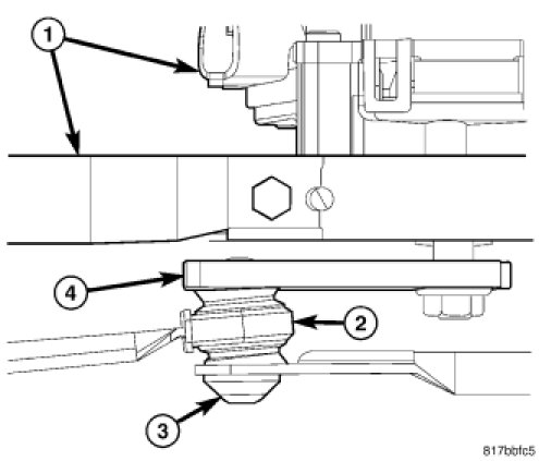 3. Position the sleeve bushing (2) of the driver side wiper drive link onto the ball stud on the end of the motor crank arm (4).