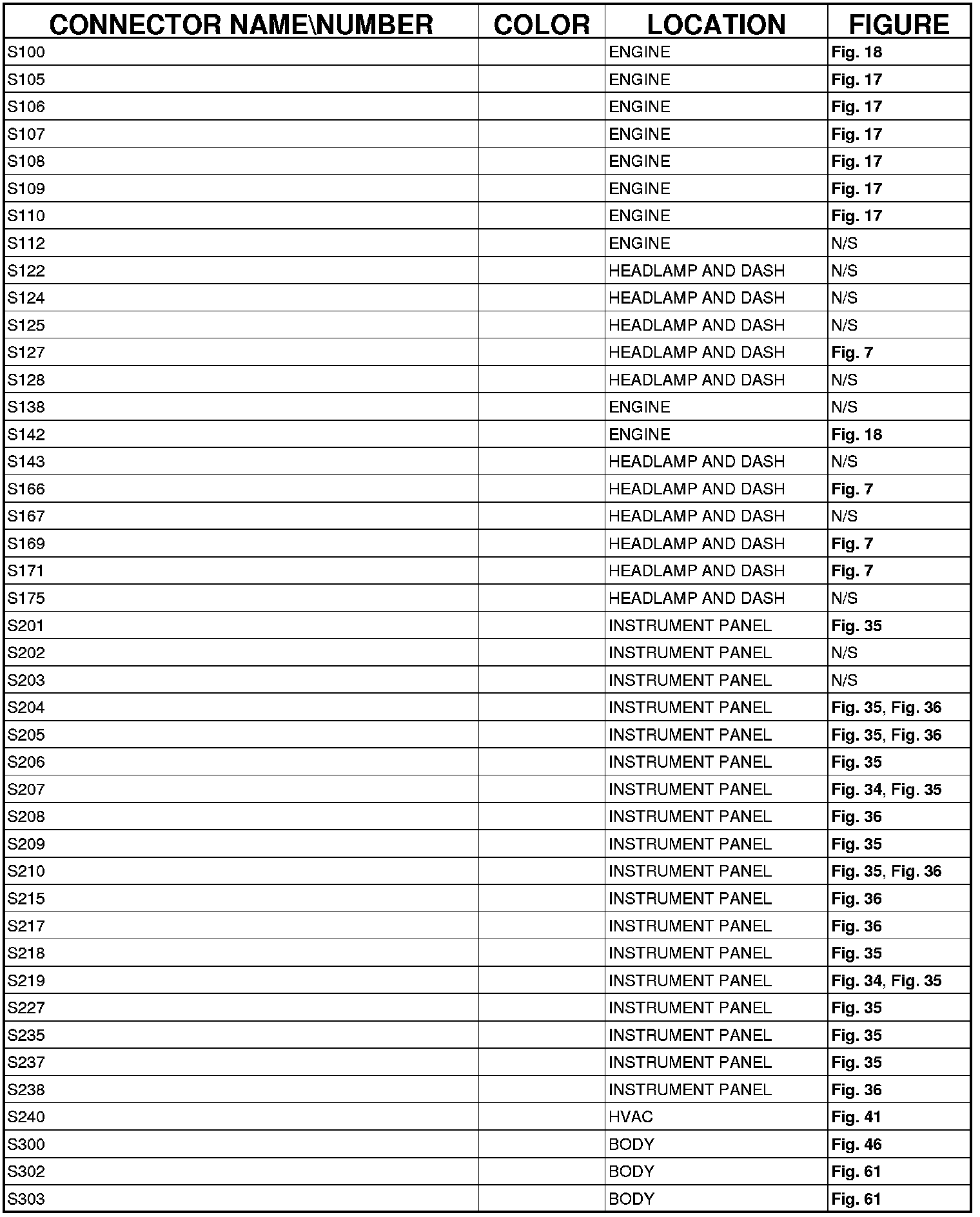 The abbreviation N/S means Not Shown in the illustrations.