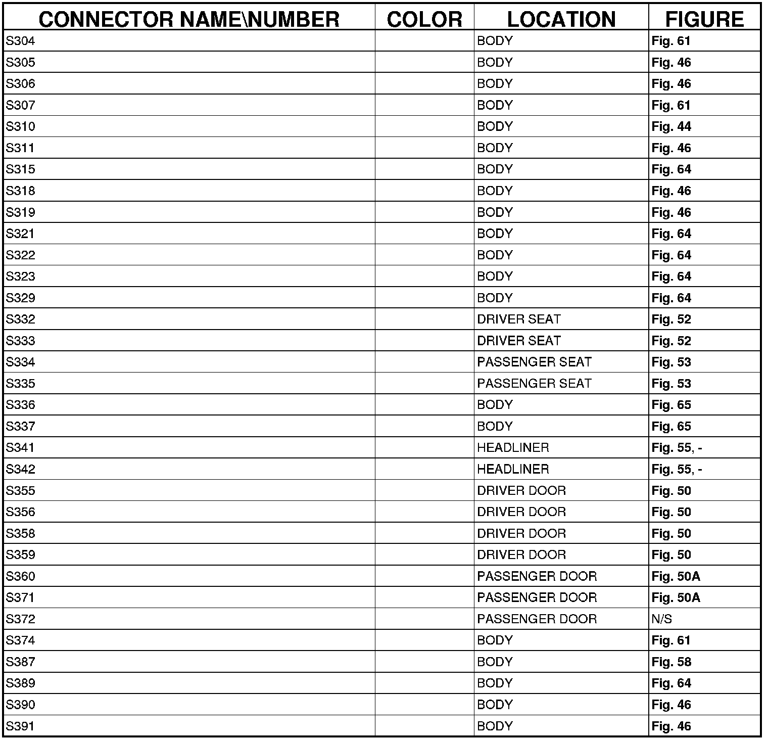 The abbreviation T/O (Take Out) is used in the location column to indicate a point in which the wiring harness branches out to a component.