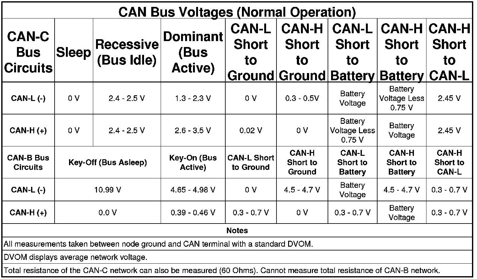 The voltage network used to transmit messages requires biasing and termination. Each module on the CAN bus network provides its own biasing and termination. There are two types of nodes used in the CAN bus network. On the CAN-C bus, a dominant node has a 120 Ohm termination resistance while a non-dominant (or recessive) node has about a 2500 to 3000 Ohm (2.5 to 3.0 kilohm) termination resistance. The dominant nodes on the CAN-C bus are the WIN and the Powertrain Control Module (PCM).
