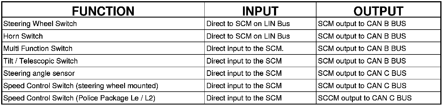 The Steering Control Module (SCM) communicates via the Local Interconnect Network (LIN) serial data bus to the steering wheel switches and the horn switch. The SCM communicates across the CAN C and CAN B. This is an ultra-low voltage serial data bus that allows the following components to communicate with the Controller Area Network (CAN) B and C data buses.