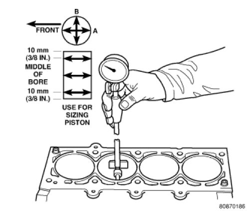 Measure the cylinder bore at three levels in directions A and B. Top measurement should be 10 mm (3/8 in.) down and bottom measurement should be 10 mm (3/8 in.) up from bottom of bore. Engine Specifications.