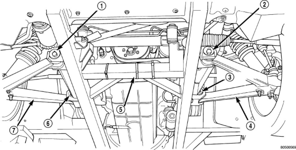 Caster angle adjustment, like camber angle adjustment, involves the repositioning of the lower control arm (4, 7) pivot bolts using the adjustment cams. There are two cams located on each lower control arm pivot bolt (1, 2), four per each corner of the vehicle front and rear. Repositioning of the pivot bolt cams in opposite directions moves the lower ball joint fore or aft as required to obtain the required caster specifications.