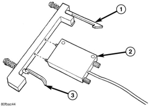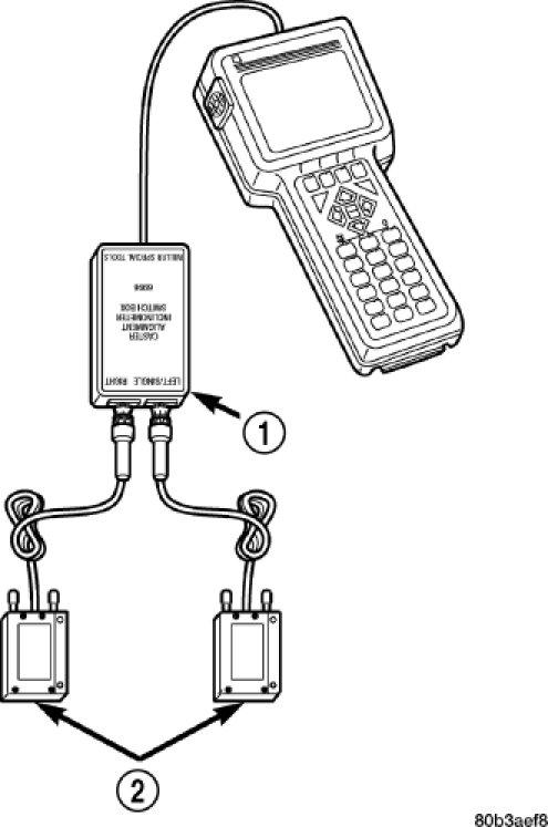 3. Attach two Inclinometers (2), Special Tool 6989, to Switch Box (1). Only two inclinometers are supplied and should be used as a pair to measure either rear caster or front caster, one at a time.
