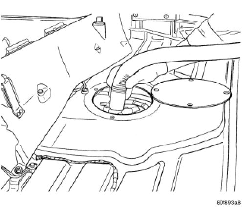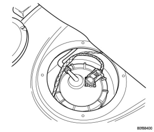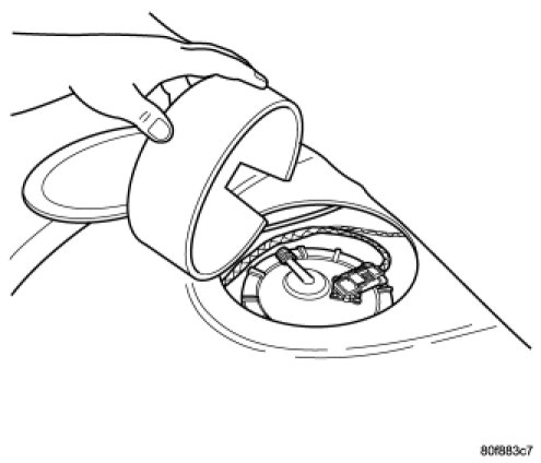 15. Lift module up to remove being careful not to spill the residual fuel that is left in it. The float arm of the level sensor catches on the inside of the fuel tank while removing the module. Tilt the module assembly to one side while removing it. Discard old seal.