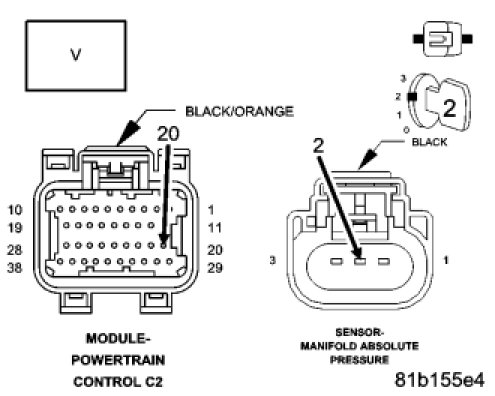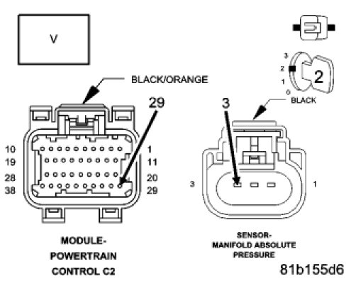 Using the wiring diagram/schematic as a guide, inspect the wiring and connectors between the MAP Sensor and the Powertrain Control Module (PCM).