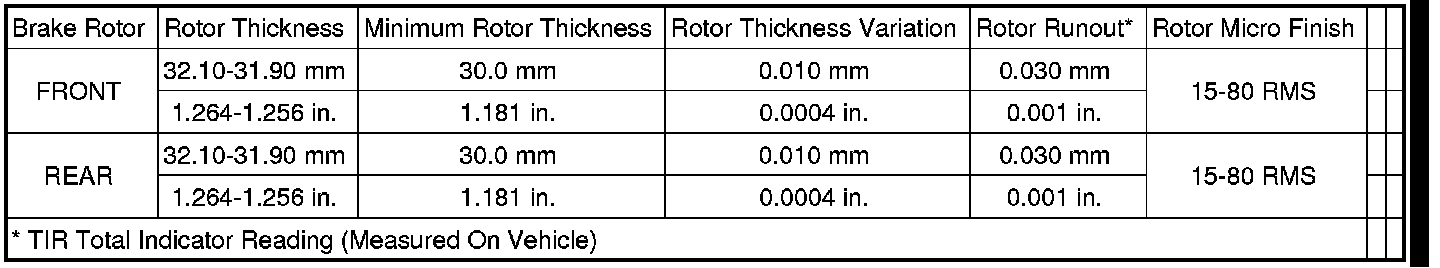 NOTE: Although front and rear rotor specifications are the same in the following table, front and rear rotors are not interchangeable. Front rotors have a different offset than do rears.