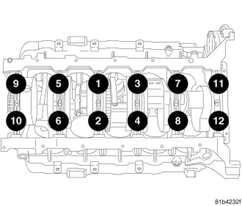 2. Tighten main bearing cap bolts 1-12 in the sequence shown to 20 Nm (15 ft. lbs.).