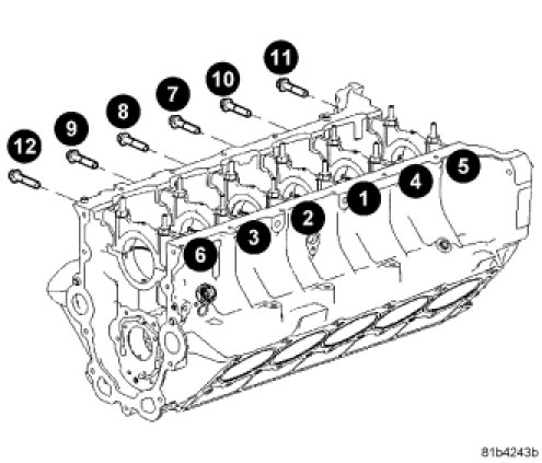 5. Tighten main bearing cap bolts 1-12 to 61 Nm (45 ft. lbs.) in the sequence shown.