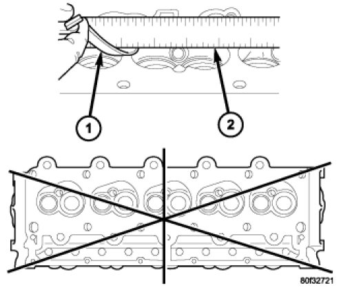 Inspect all surfaces with a straightedge (2) if there is any reason to suspect leakage. If out-of-flatness exceeds 0.019 mm (0.00075 in.) times the span length in inches in any direction, either replace head or lightly machine the head surface. As an example, if a 12.0 inch span is 1.0 mm (0.004 in.) out-of-flat, allowable is 12 x 0.019 mm (0.00075 in.) equals 0.22 mm (0.009 in.). This amount of out-of-flat is acceptable. *Maximum of 0.2 mm (0.008 in.) for grinding is permitted.