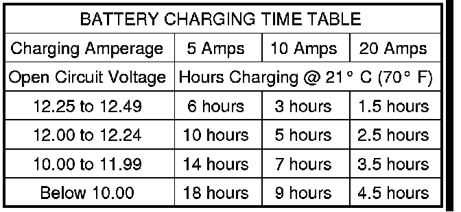 The Battery Charging Time Table gives an indication of the time required to charge a typical battery at room temperature based upon the battery state-of-charge and the charger capacity.