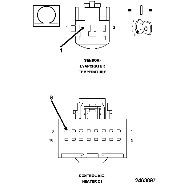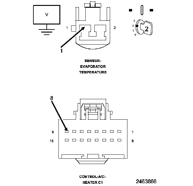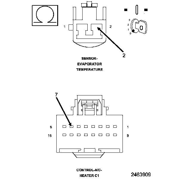 1. Measure the resistance of the (C121) Sensor Ground circuit between the A/C Heater Control C1 harness connector and the Evaporator Temperature Sensor harness connector.