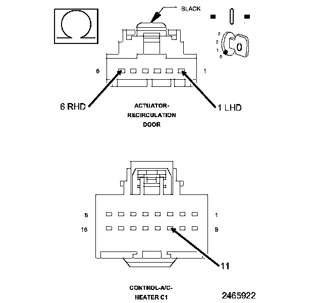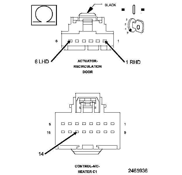 1. Measure the resistance of the (C34) Common Door Driver circuit between the A/C Heater Control C1 harness connector and the Recirculation Door Actuator harness connector.