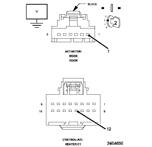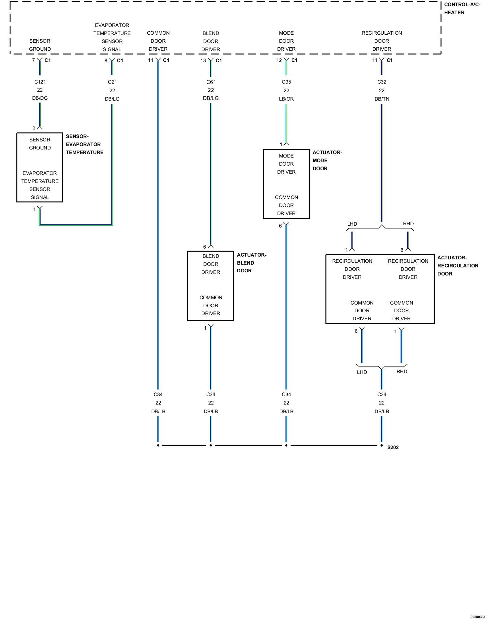 After the initial installation of the A/C Heater Control, the controller is calibrated to each individual blend/mode door actuator. These calibrations are stored as in the number of pulses it takes to move the door from one stop to another. The A/C Heater Control drives the Door Actuators by the use of Door Driver circuit and a Common Door Driver circuit and monitors all door actuator pulses to detect door movement in both directions. Most of the door actuators share a common door driver circuit but each door actuator has its own unique driver circuit. Due to shared circuitry, similar Diagnostic Trouble Codes (DTCs) can set at the same time for multiple actuators depending upon the type of circuit malfunction, its location, and the direction the actuator is moving when the malfunction is present.