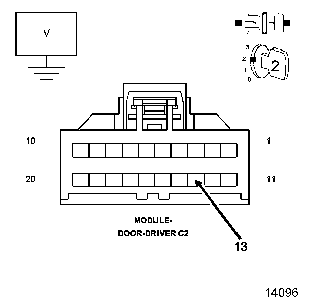 4. Measure the voltage between ground and the (Q221) Master Switch Left Front Window Mux circuit in the Driver Door Module C2 connector.