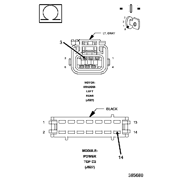 2. Measure the resistance between the (Q111) Left Rear Window Driver (Up) circuit in the PTCM C2 connector (cavity 14) and the (Q211) Left Rear Window Driver (Down) circuit in the motor connector (cavity 3).