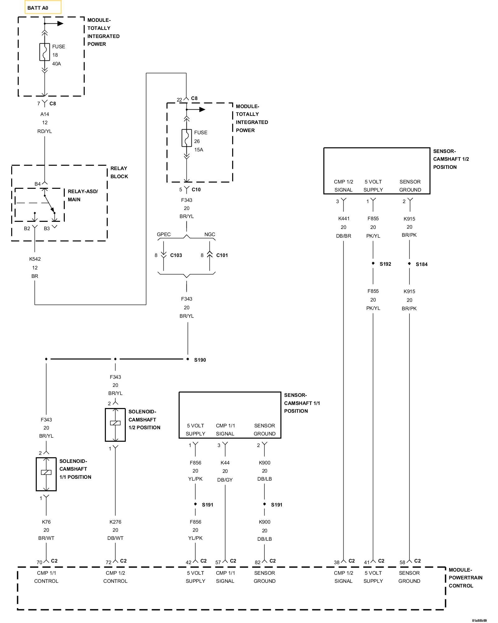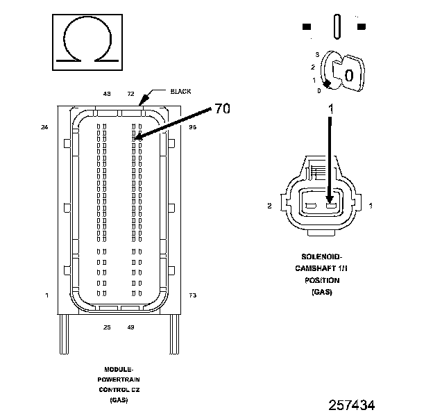 1. Using the wiring diagram/schematic as a guide, inspect the wiring and connectors between the Camshaft 1/1 Position Solenoid and the Powertrain Control Module (PCM).