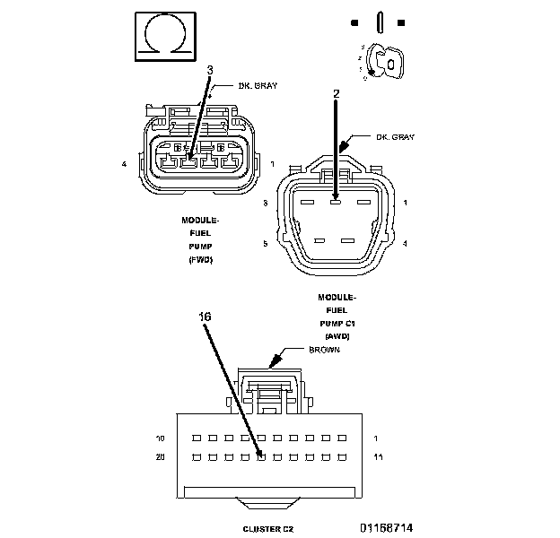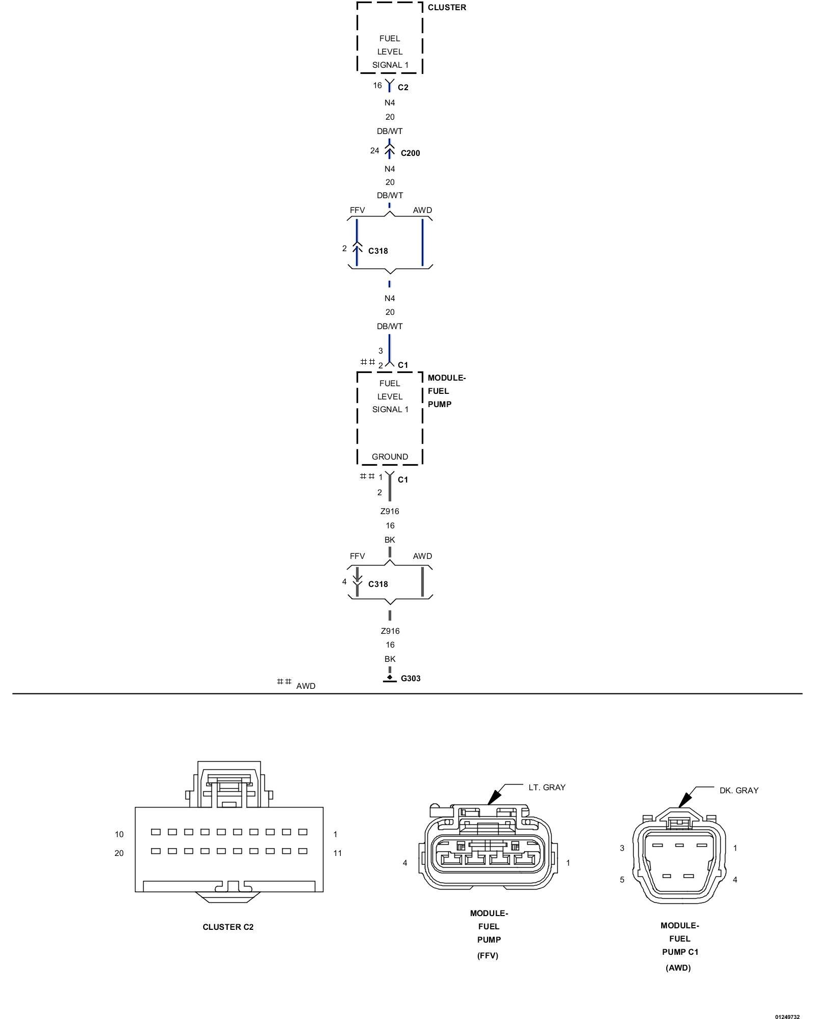 1. Using the wiring diagram/schematic as a guide, inspect the wiring and connectors between the Fuel Level Sensor and the Instrument Cluster (CCN).