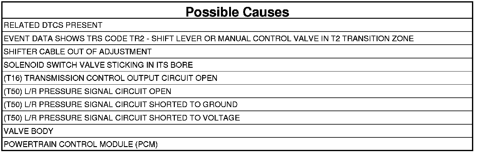 - This indicates the shift lever and the manual control valve were in the T2 transition zone between Neutral and OD. Check the shifter cable for: proper adjustment, binding, friction, improper routing, or the shifter was moved in transit. Repair as necessary.