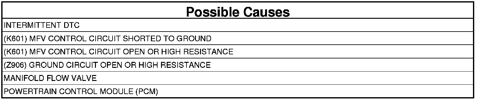 - Repair the (K601) MFV Control circuit for an open circuit or high resistance.