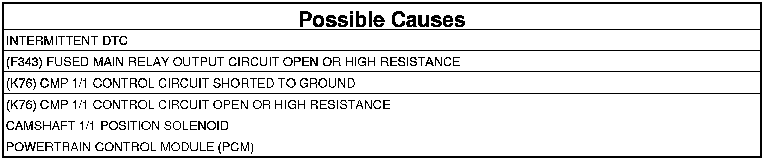 1. Using the wiring diagram/schematic as a guide, inspect the wiring and connectors between the Camshaft 1/1 Position Solenoid and the Powertrain Control Module (PCM).