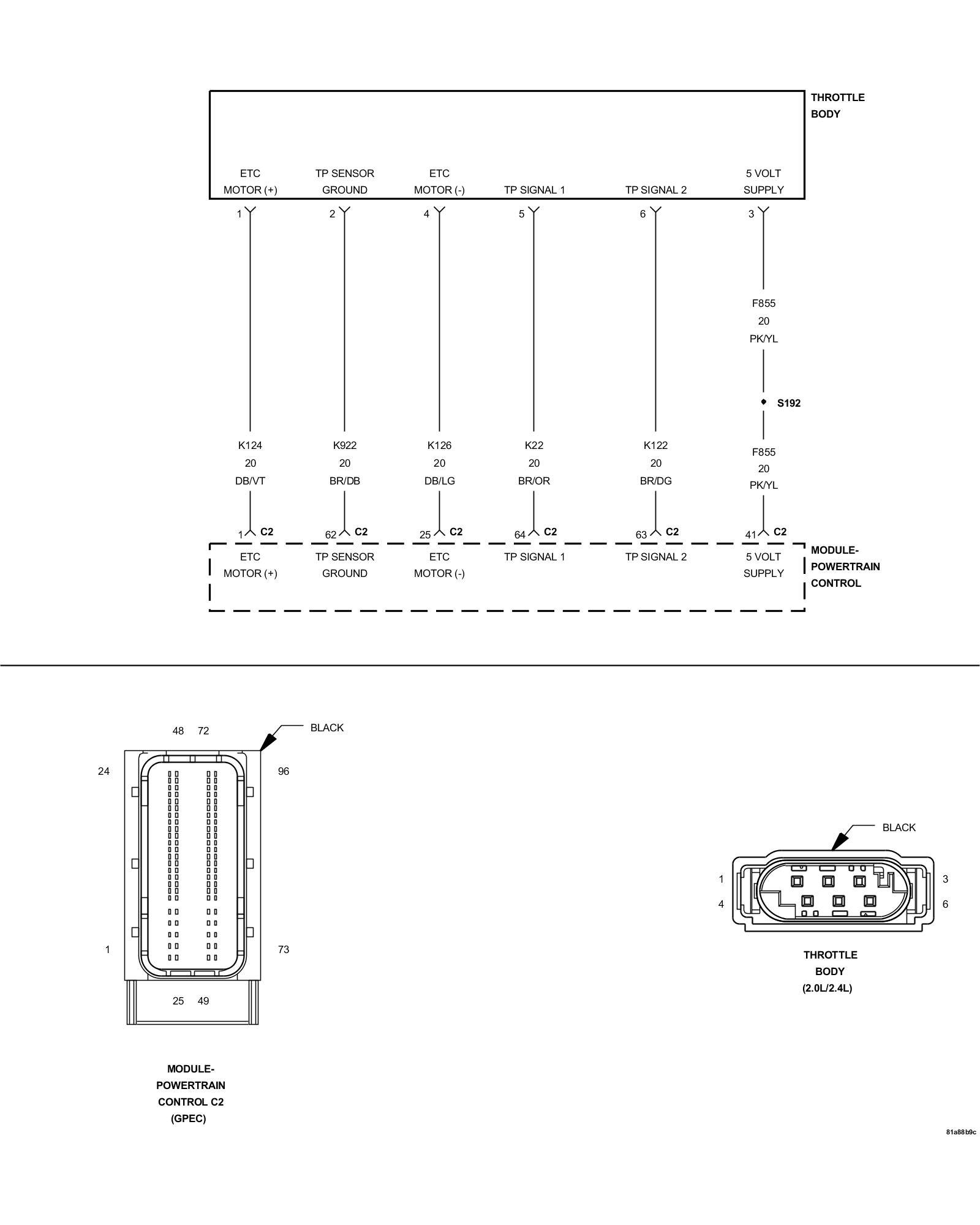 1. Using the wiring diagram/schematic as a guide, inspect the wiring and connectors between the Throttle Body and the Powertrain Control Module (PCM).