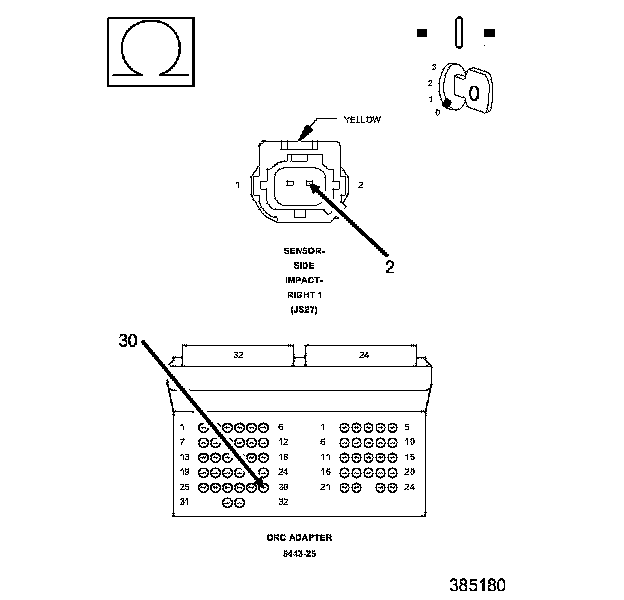 1. Measure the resistance of the (R19) Left Side Impact Sensor 2 Ground circuit between the Left Side Impact Sensor 2 connector and the ORC 8443-25 Adaptor.