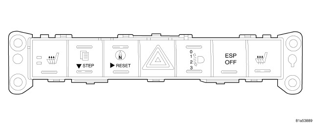 The ASBM (3) is located just below the radio (1) and just above the heater and air conditioner controls (2) in the center stack area of the instrument panel. This switch is available in multiple configurations, which vary from a single momentary push button switch to as many as six momentary push button switches, depending upon the optional equipment in the vehicle. The pod may include the following switches:
