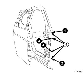 4. Remove the nuts (5) attaching the door to the door hinges and remove the door from the vehicle.