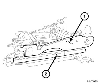 The Front Tilt Motor (2) is located on the upper power seat adjuster assembly and controls the up and down movement of the seat front only. The front tilt motor is part of the power seat track unit (1) and must be replaced as an assembly, Power Seat Track - Removal.