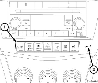 The ESP Off Switch is part of the accessory switch bank module (1) located in the center bezel (2) on the instrument panel below the radio. The ESP Off switch turns the Electronic Stability Program off whenever the switch is depressed. Depressing the switch a second time turns the ESP(R) back on. The switch resets itself each time the ignition is cycled.