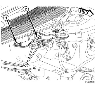 1. Align the brake fluid level switch with its mounting hole on the right side of the master cylinder brake fluid reservoir. Push the switch into the fluid reservoir until the switch retaining tabs (1) are expanded on the opposite side of the reservoir (2), locking it in place.