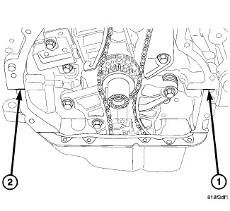 6. Apply 2 mm bead of Mopar(R) engine sealant RTV (or equivalent) to the engine block (1,2) as shown.