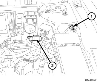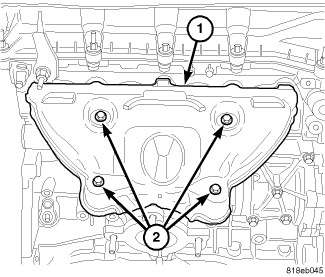 4. Install exhaust manifold heat shields (1). Tighten bolts (2) to 12 Nm (105 in. lbs.).