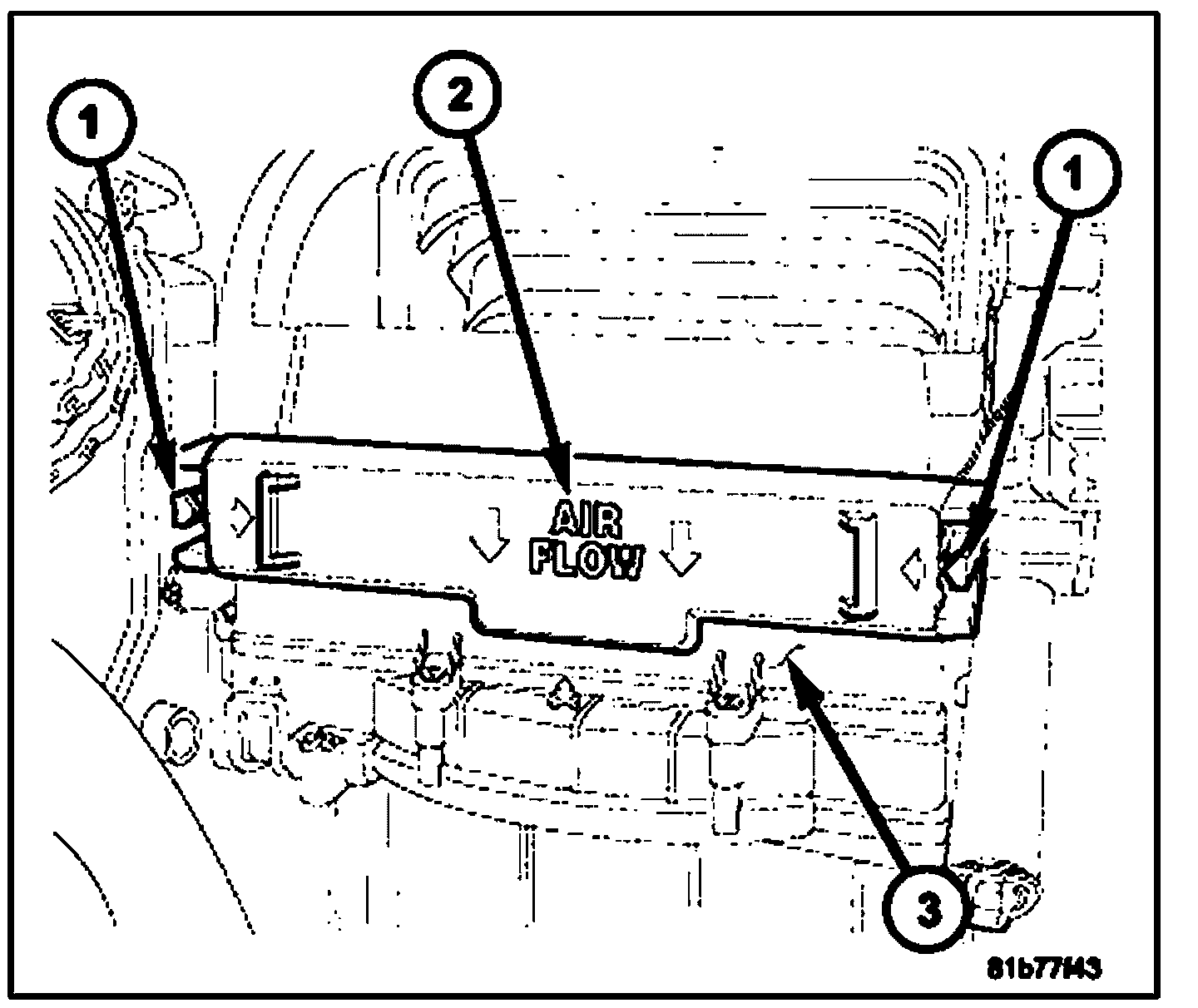 2. Position the particulate air filter cover (2) to the HVAC housing (3) and engage the two retaining tabs (1) that secure the cover to the housing. Make sure the retaining tabs are fully engaged.