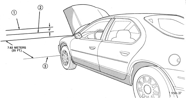 Prepare an alignment screen Adjustments. A properly aligned fog lamp unit will project a pattern on the alignment screen 100 mm (4 in.) (2) below the fog lamp center line (1) and straight ahead.