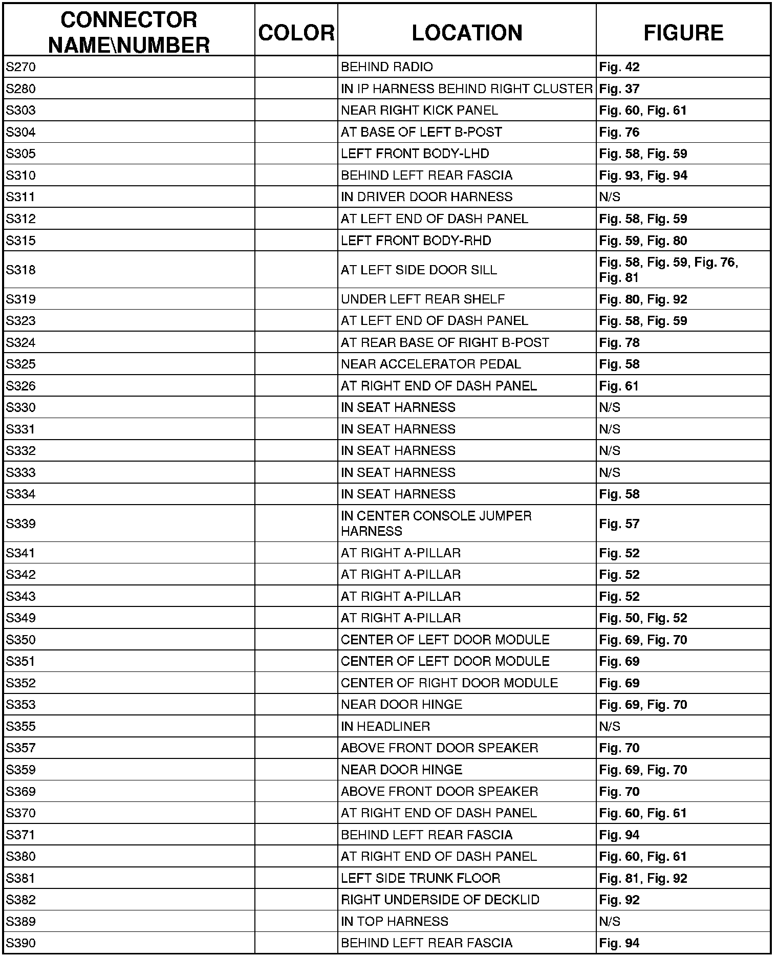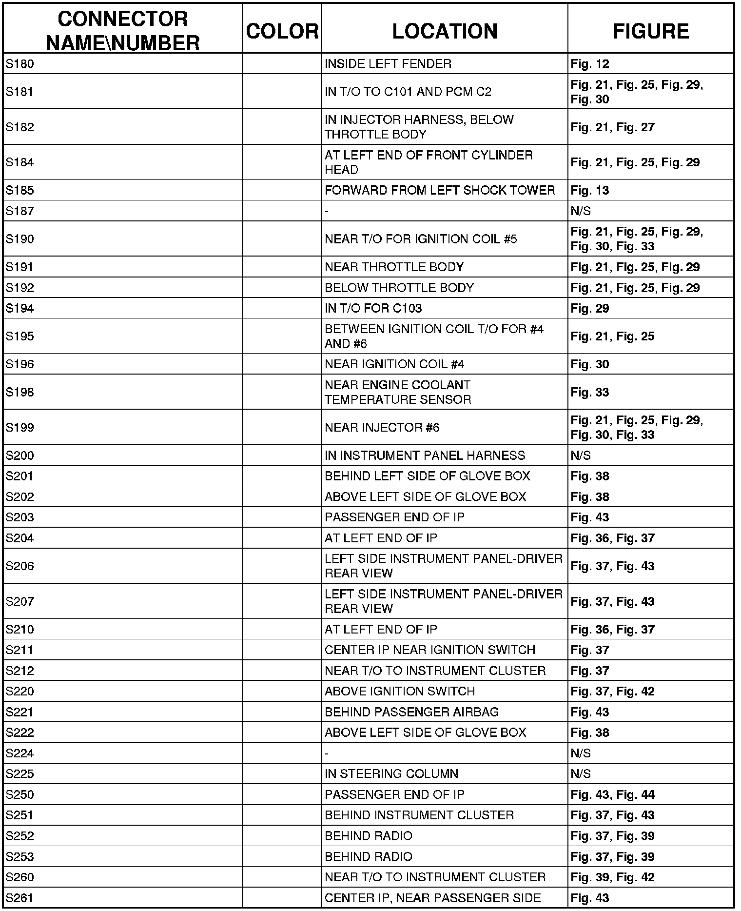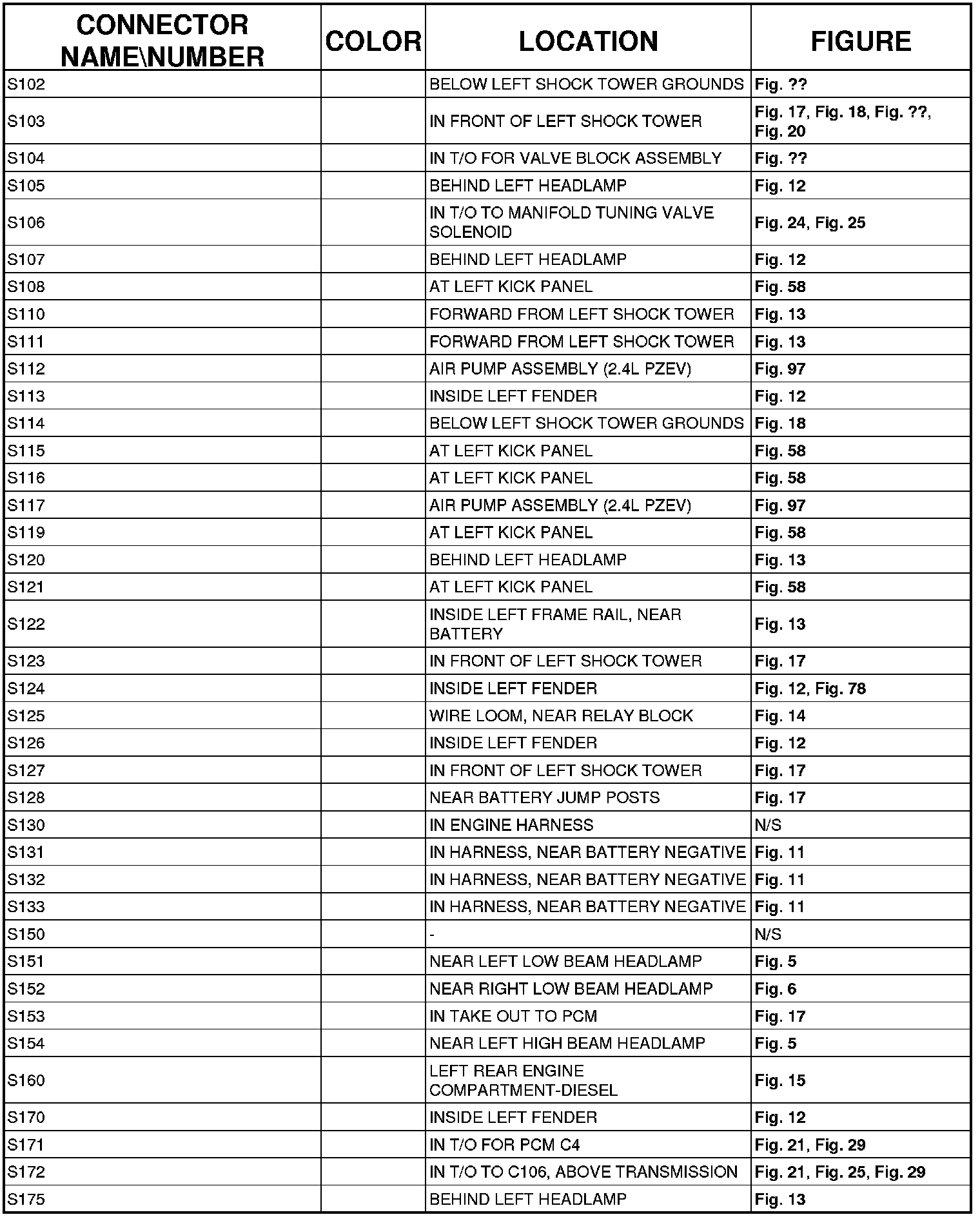 The abbreviation T/O (Take Out) is used in the location column to indicate a point in which the wiring harness branches out to a component.