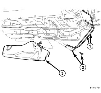6. Position fuel tank onto a transmission jack or equivalent and raise the fuel tank (3) into vehicle position.