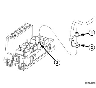 10. Remove the Totally Integrated Power Module (TIPM) from the mounting bracket and turn upside down. Remove the retaining nut (1) and remove the battery harness cable (2) from the TIPM stud (3).